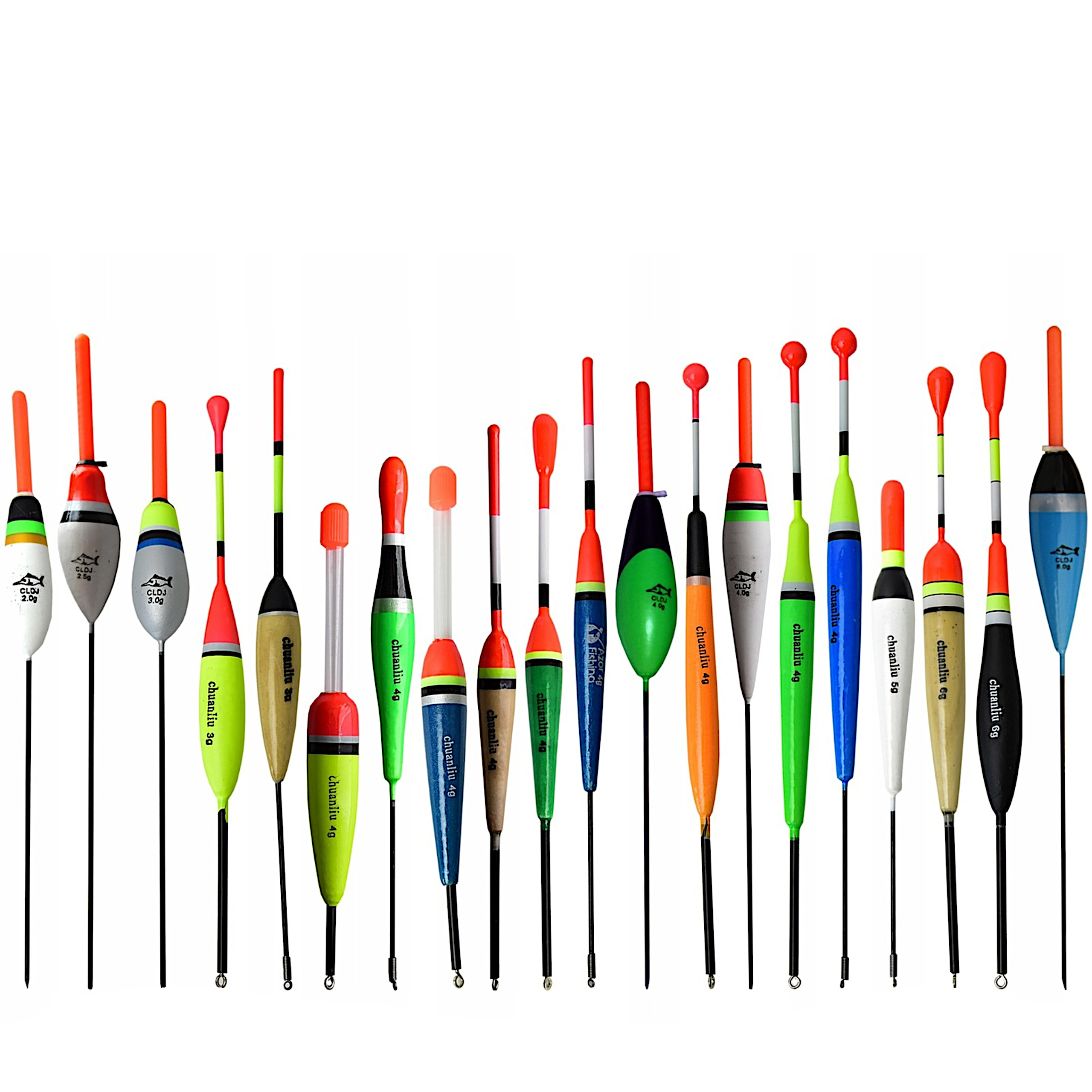 - 20 sztuk spławików o różnej gramaturze począwszy od 2 do 7 gram w tym: